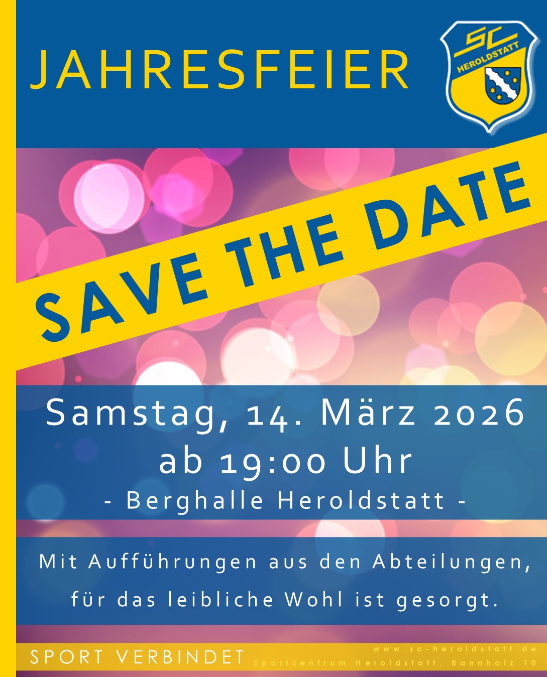 Hallo liebe Mitgliederinnen und Mitglieder, Freunde und Fans des SCH! Aufgrund von Terminüberschneidungen findet unsere Jahresfeier in diesem Jahr nicht im November, sondern am 14. März 2026 statt. Tragt euch den Termin gerne gleich in euren Kalender ein. Weitere Programm-Infos folgen vorab.